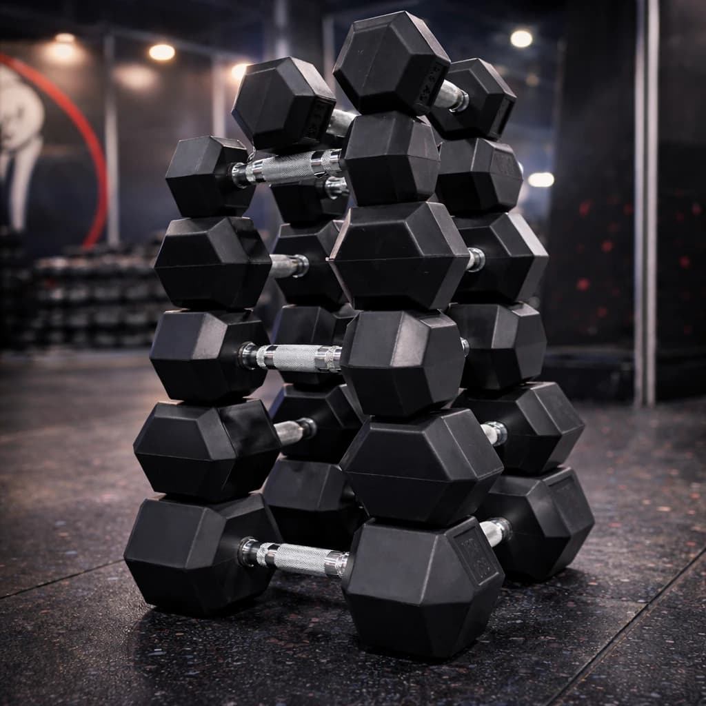 Mancuernas de caucho con diseño hexagonal antirrodamiento. Estructura sólida para uso intensivo.